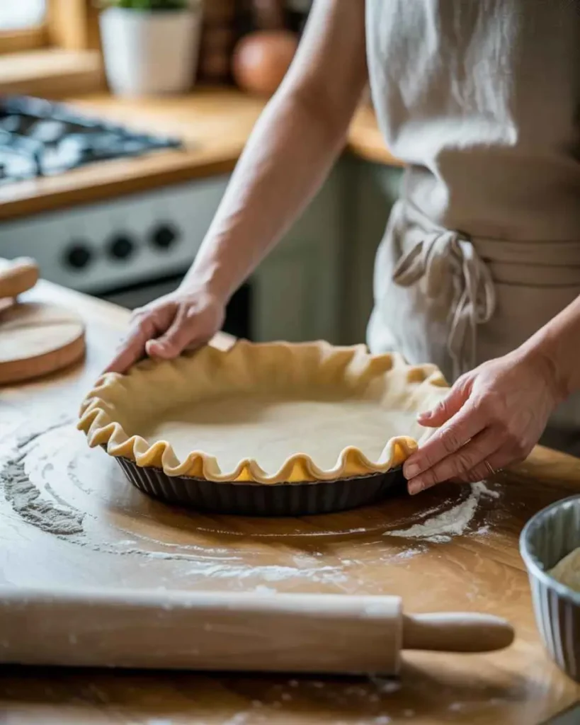 - Roll out and place dough in a 9-inch pie dish. Chill for 15 minutes.