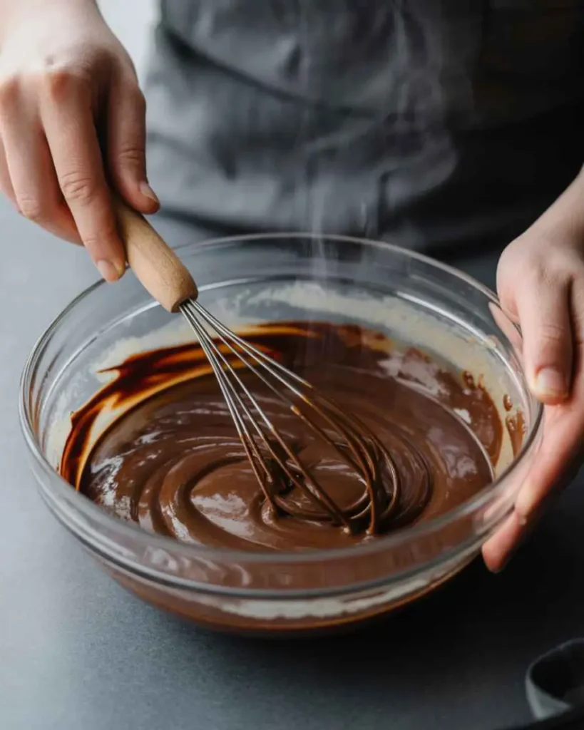 4. Carefully whisk in the boiling water or coffee. The batter will be thin this is key for moist chocolate cake recipes.