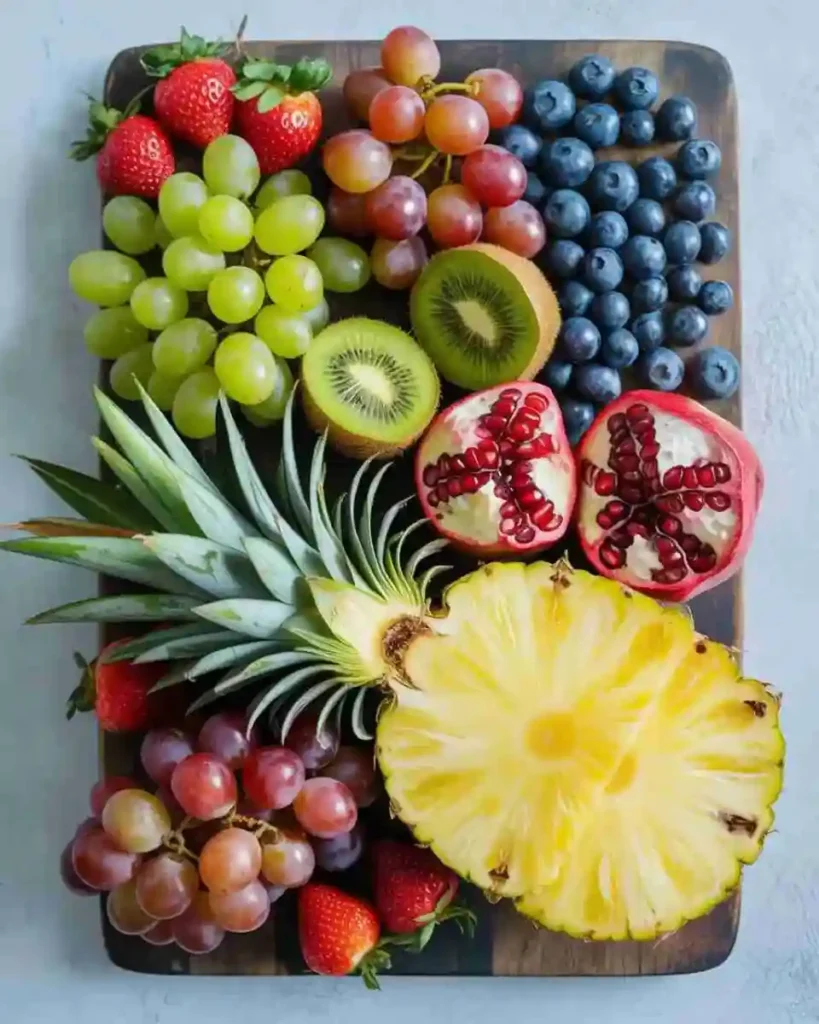 Grapes, berries, citrus, kiwi, pomegranate, pineapple.