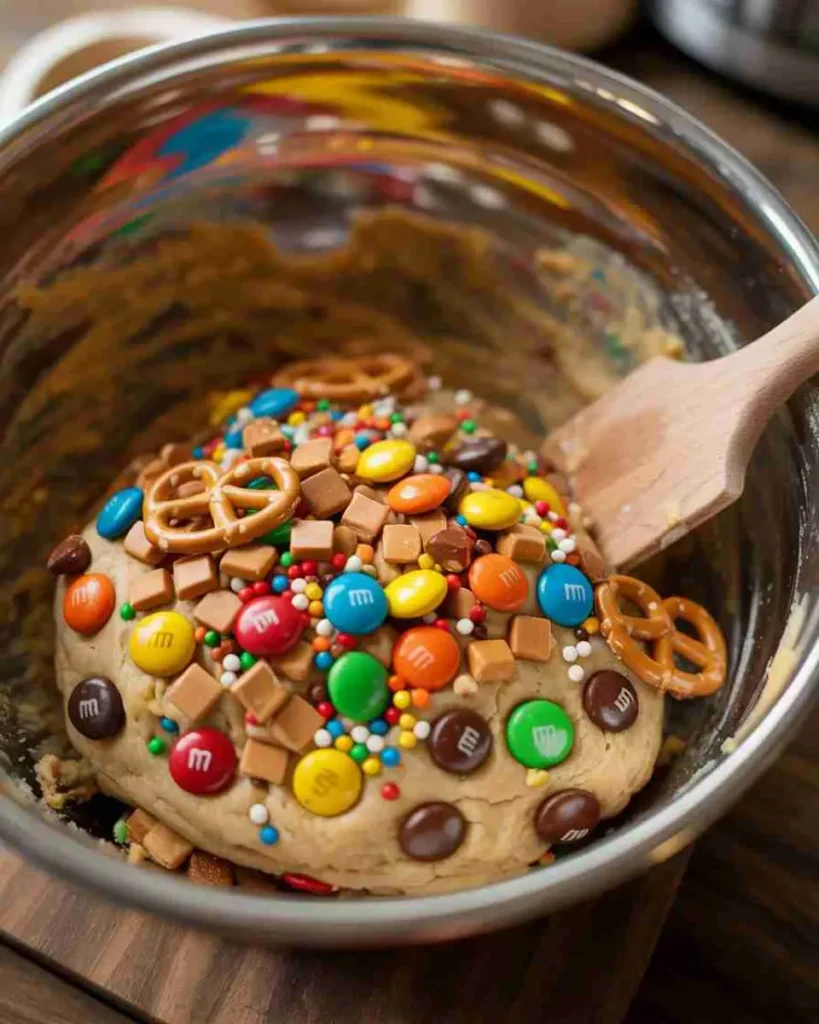 - Fold in chocolate chips, pretzels, M&Ms, sprinkles, and extras.