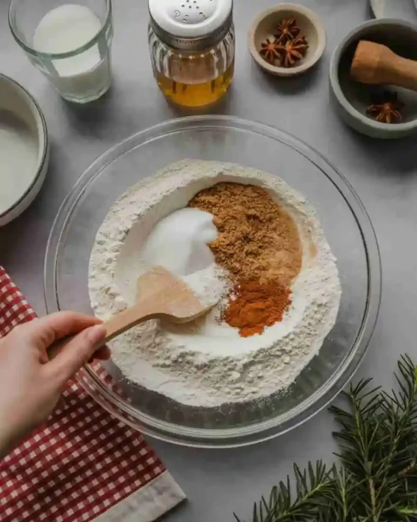 - Whisk flour, sugar, baking powder, baking soda, salt, cinnamon, and nutmeg.