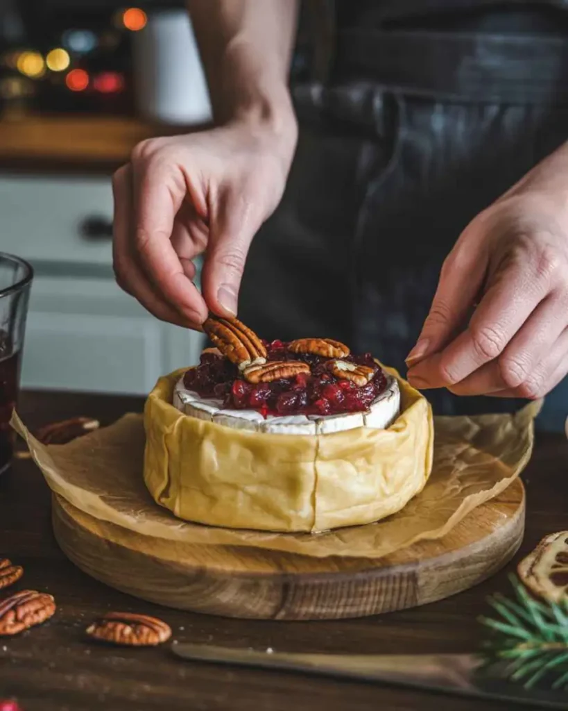- Preheat oven to 375°F. Wrap brie in puff pastry, top with cranberry sauce and pecans, and bake for 20-25 minutes.