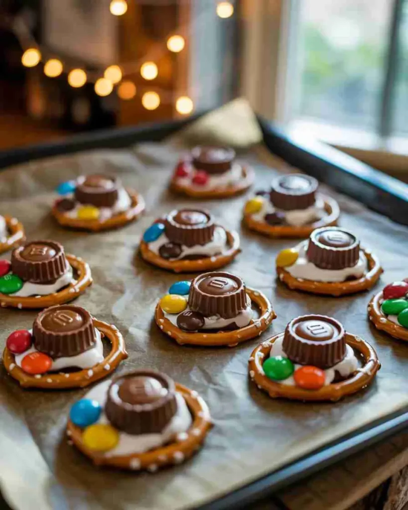 Kids can help add pretzels, place Rolos, or top with M&Ms.