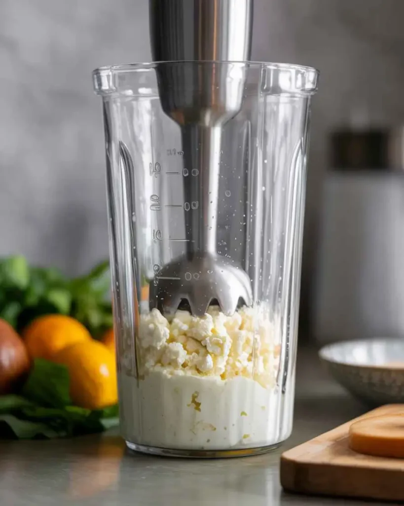Using an immersion blender (or high-speed blender), blend the cottage cheese for 3–4 minutes.