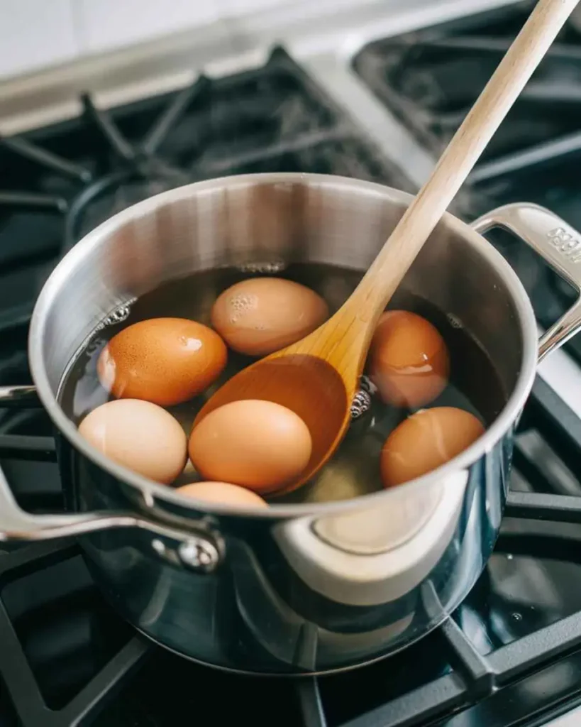 - Bring 6 inches of water to a boil and gently lower cold eggs into the pot.