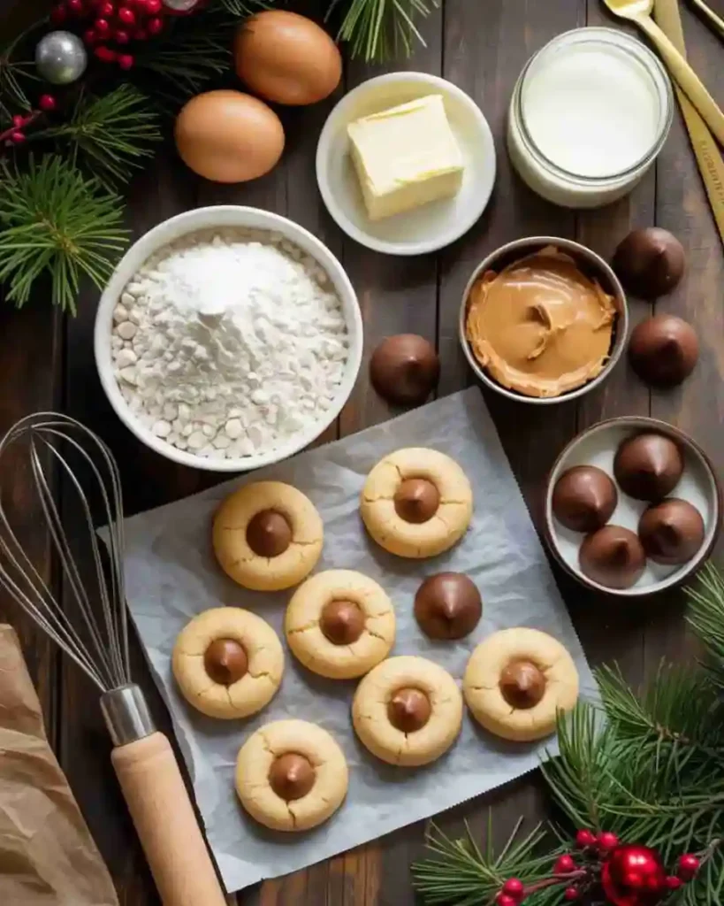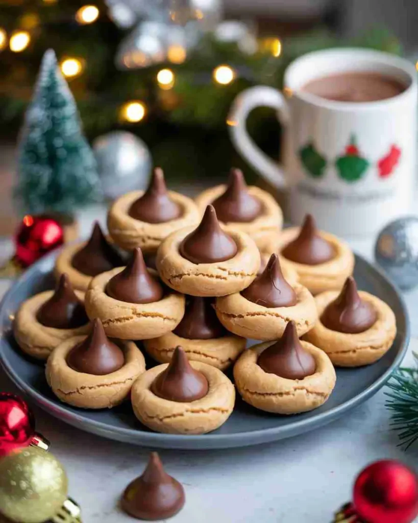 Soft peanut butter cookies topped with a chocolate kiss. A nostalgic favorite that pairs beautifully with other easy Christmas cookies.