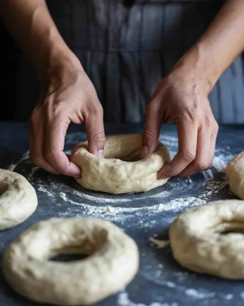 Divide the dough evenly, roll into ropes, and shape into rings. Pinch the ends to seal.