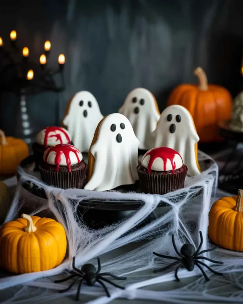 Balance the cute with the creepy. Pair friendly ghost treats with blood-drip cupcakes or brain-shaped gelatin molds. Label everything with fun names like “Frankenstein Fudge” or “Witch’s Fingers” to add humor. And don’t forget napkins sticky fingers are almost guaranteed.