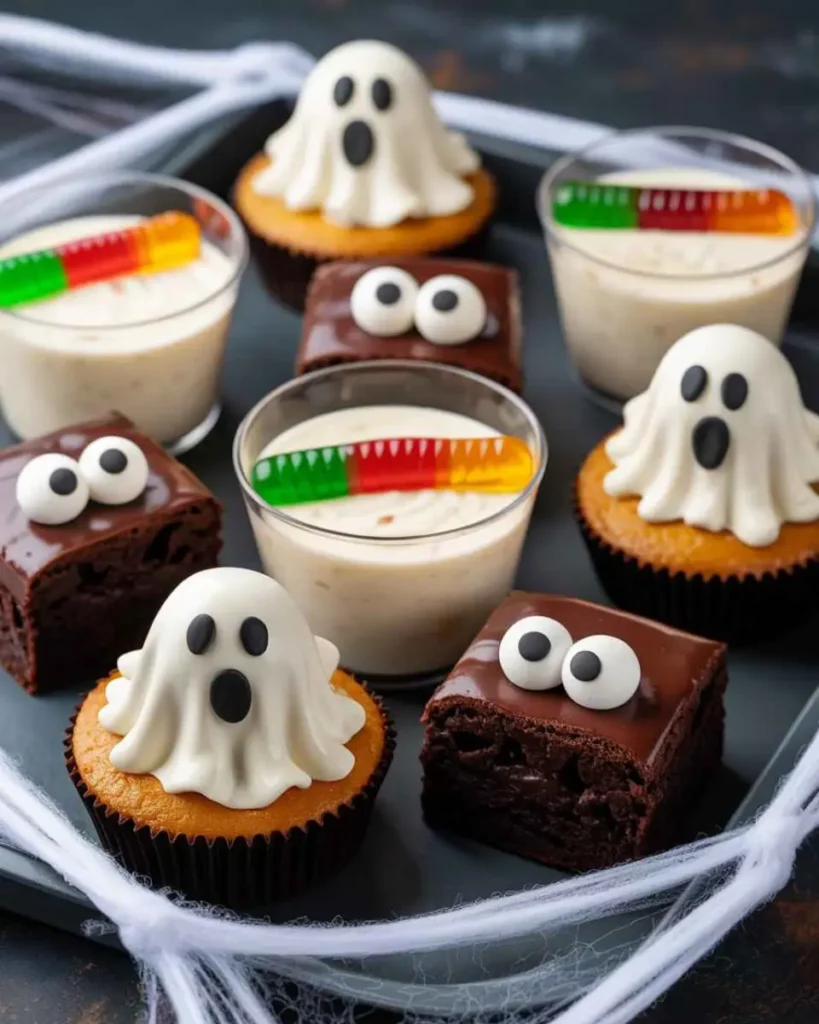 Want something more creative? Mini ghost meringues or “slime” parfaits made with lime gelatin and whipped cream are easy to prep ahead. For extra convenience, serve your desserts in cupcake liners or small mason jars perfect for quick cleanup.