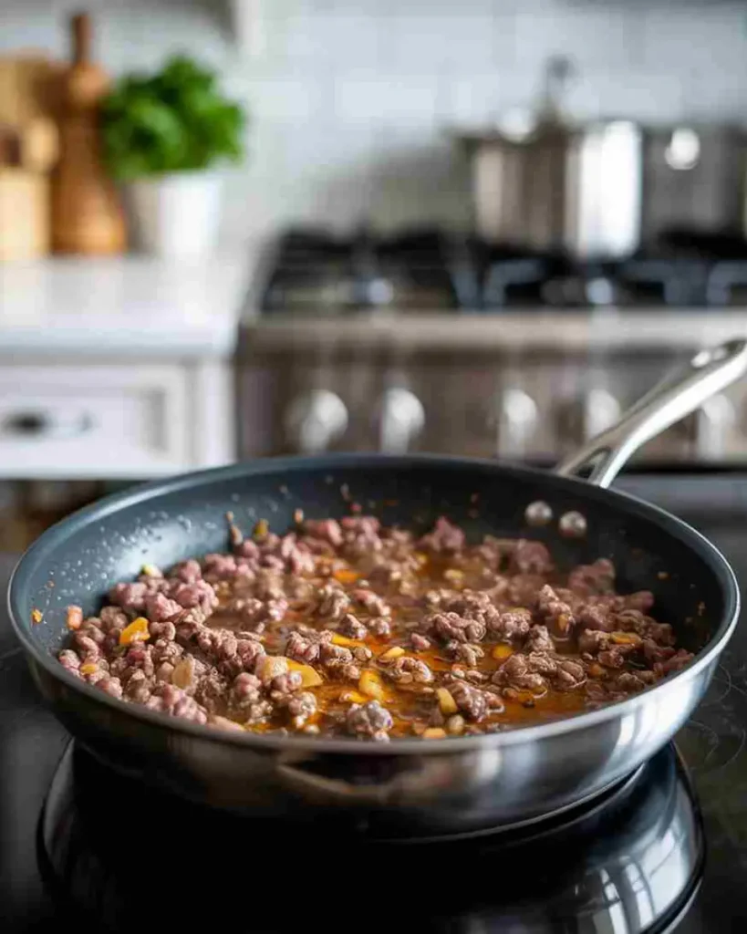 Heat a large skillet over medium-high heat. Add ground beef, Worcestershire sauce, garlic powder, and salt. Cook until browned and fully cooked, about 8–9 minutes. Drain excess grease if needed.