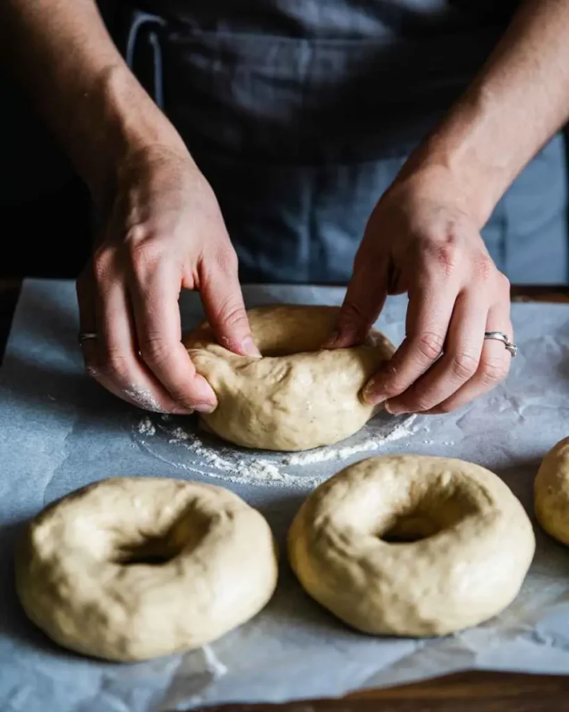 Divide into 4 equal balls. Roll each into a rope and join ends to form bagels (or poke a hole in the center and stretch gently).