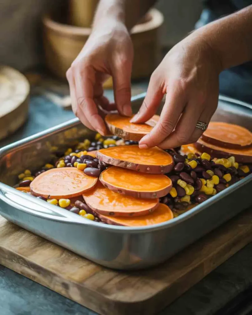 Packed with fiber and plant-based protein, this colorful vegetarian casserole layers roasted sweet potatoes, black beans, and corn for a wholesome dinner everyone loves.
