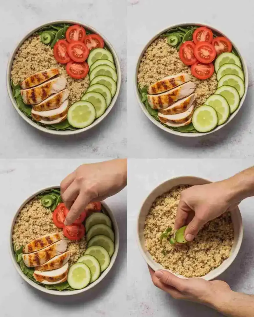- Assemble bowl with quinoa, sliced grilled chicken, broccoli, and avocado.