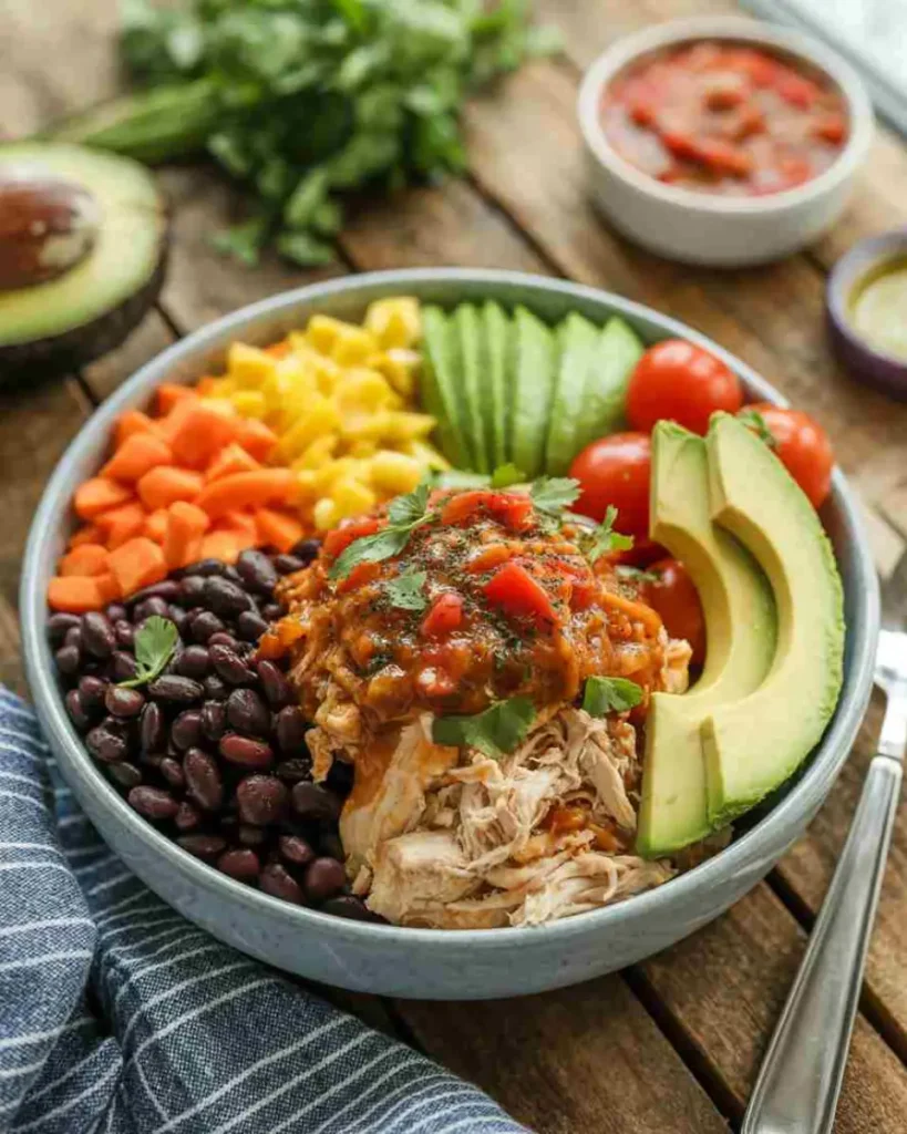 Packed with lean chicken, beans, and vegetables, this bowl delivers fiber, protein, and vibrant flavors.