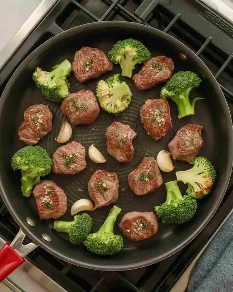 Juicy pieces of seared steak tossed in garlic butter and served with roasted broccoli.