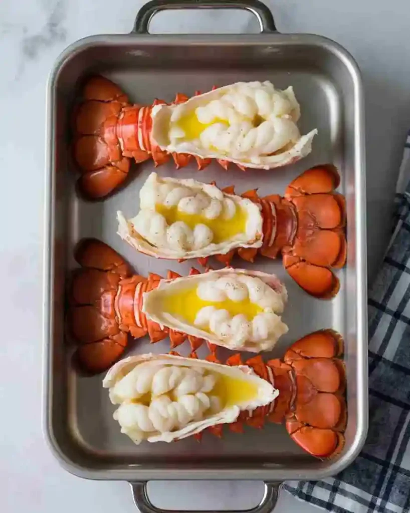 Lobster tails are baked with butter and seasoning until just opaque.