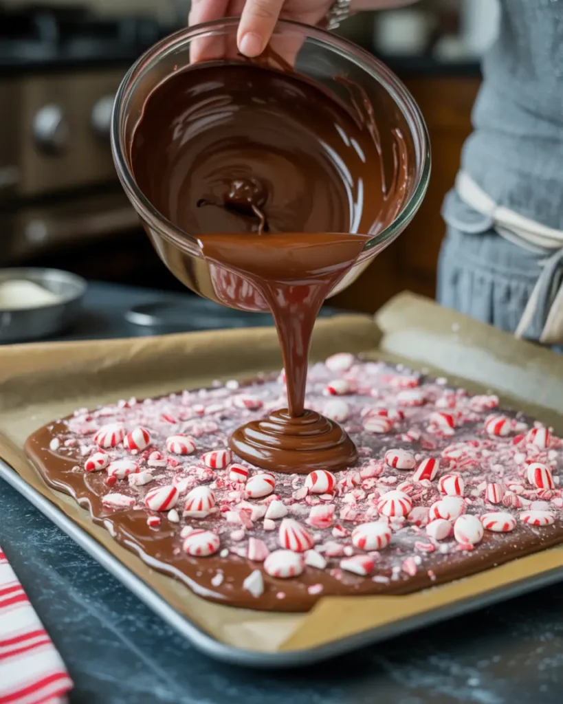 • Stir in peppermint extract and pour mixture onto baking sheet.