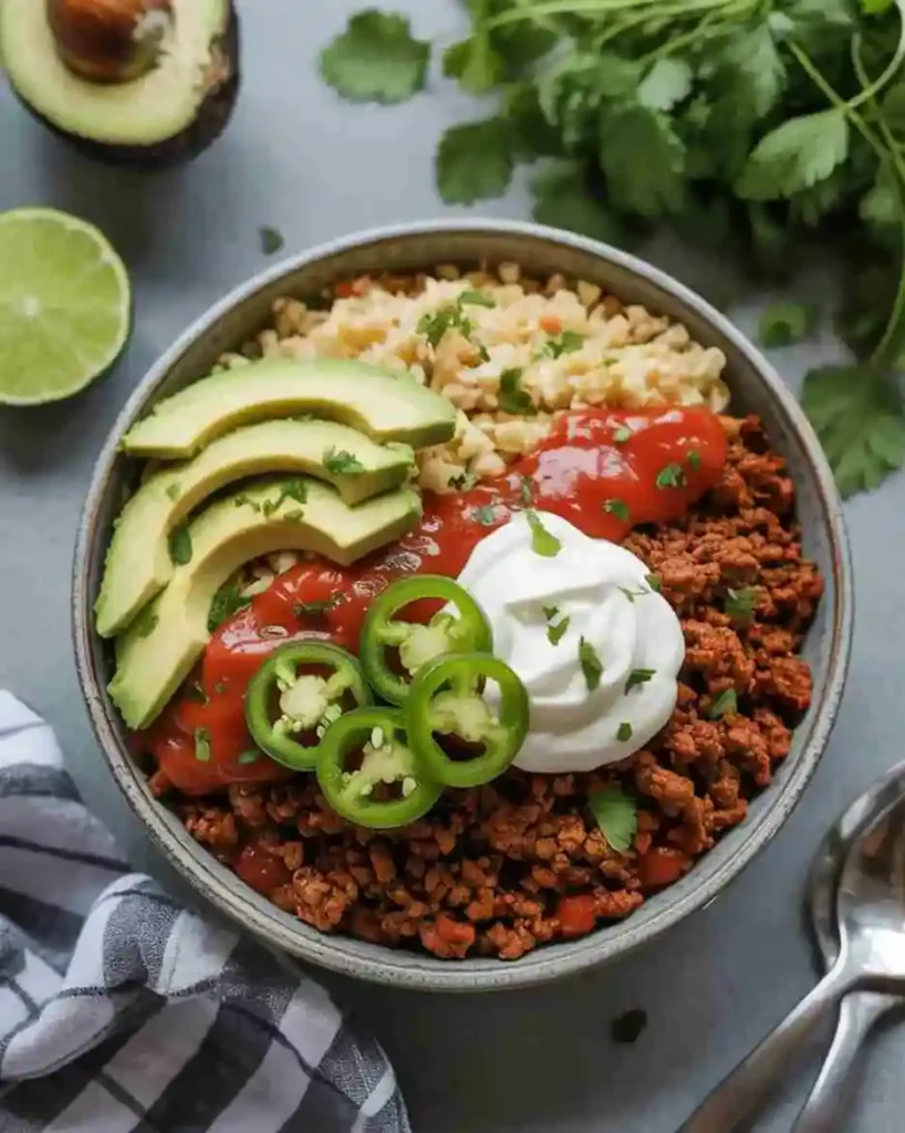Seasoned ground beef served over cauliflower rice, shredded cabbage, or lettuce with avocado, sour cream, or keto sauces.