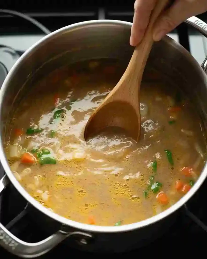 - Pour in bone broth and bring to a simmer.