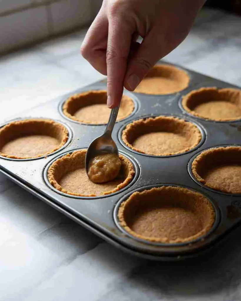 Crush graham crackers or cookies and mix with melted butter until sandy. Press firmly into lined muffin tins.