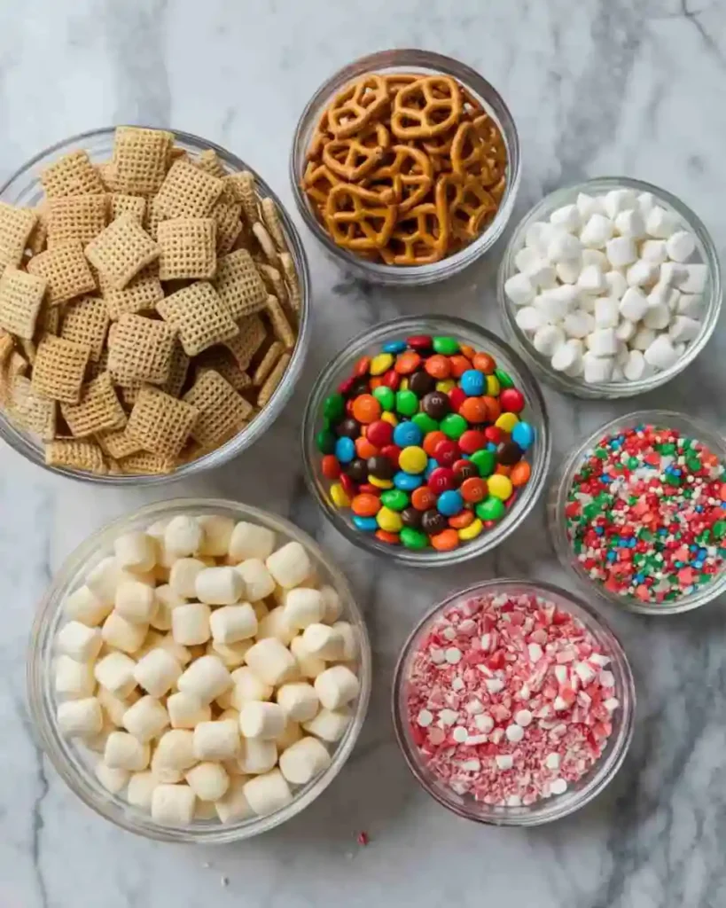 It’s a Christmas snack mix made with cereal, pretzels, chocolate, marshmallows, and festive candies.