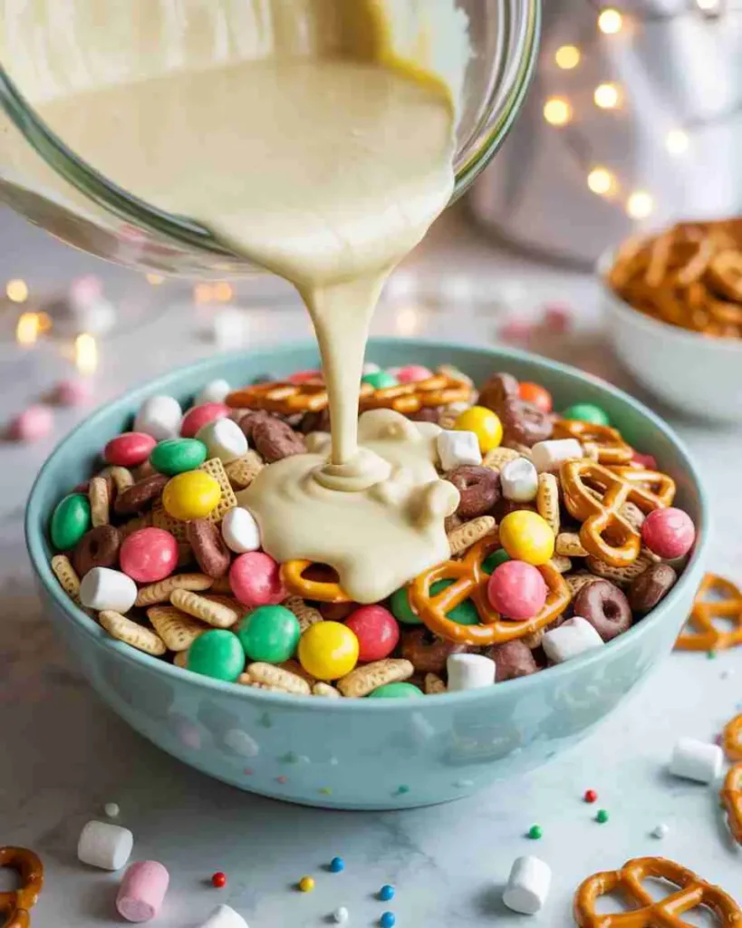 Pour melted chocolate over the mix and toss gently until coated. - Add Festive Flair