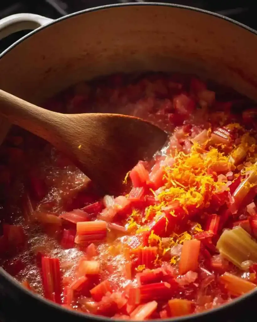 Combine rhubarb, sugar, water, orange juice, and zest in a large pot.