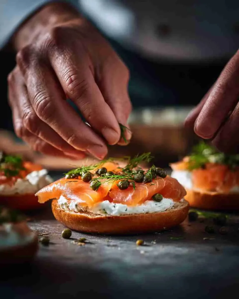 - Layer smoked salmon slices on top.